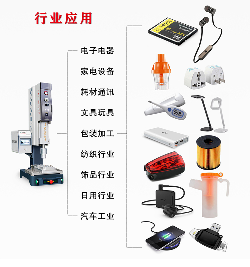 通過表格內容,我們可以清晰的看出,南方力勁高端超聲波塑料焊接機可應用在多個行業(yè)多個領域,真正的實現(xiàn)一機多用,提高使用效率!