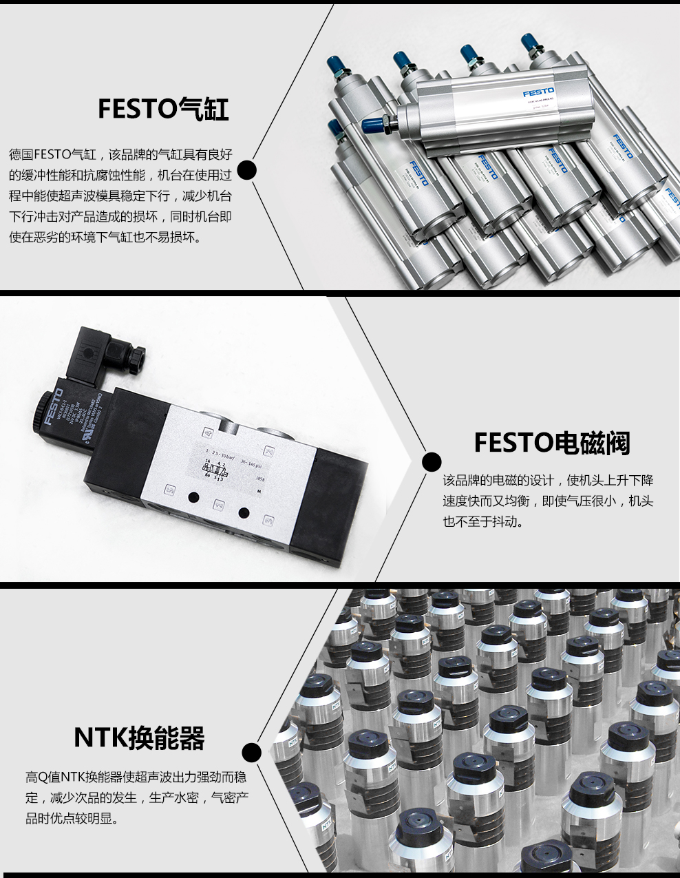 1.本機采用NTK換能器,FESTO氣缸,SMC調壓閥;