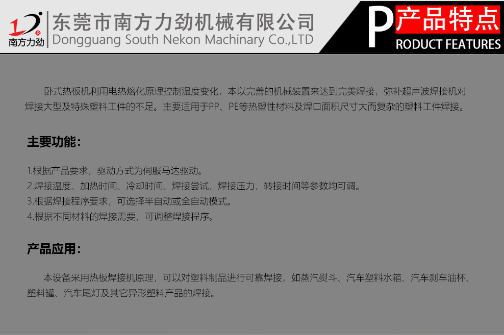 臥式熱板對(duì)接機(jī)是臥式熱板機(jī)的新型機(jī)。相對(duì)普通的立式而言,長(zhǎng)度不受限制。廣泛運(yùn)用于法蘭盤(pán)、汽車尾箱、油箱、尾氣凈器、空氣過(guò)濾器等大型塑料件、異性件。根據(jù)焊接面,臥式熱板機(jī)分為單面焊、雙面焊、對(duì)焊等不同規(guī)格,根據(jù)工件結(jié)構(gòu),選擇最佳的分模設(shè)計(jì)方案,增強(qiáng)焊接面的牢固性。降低熔接深度。提高生產(chǎn)效率和產(chǎn)品合格率。